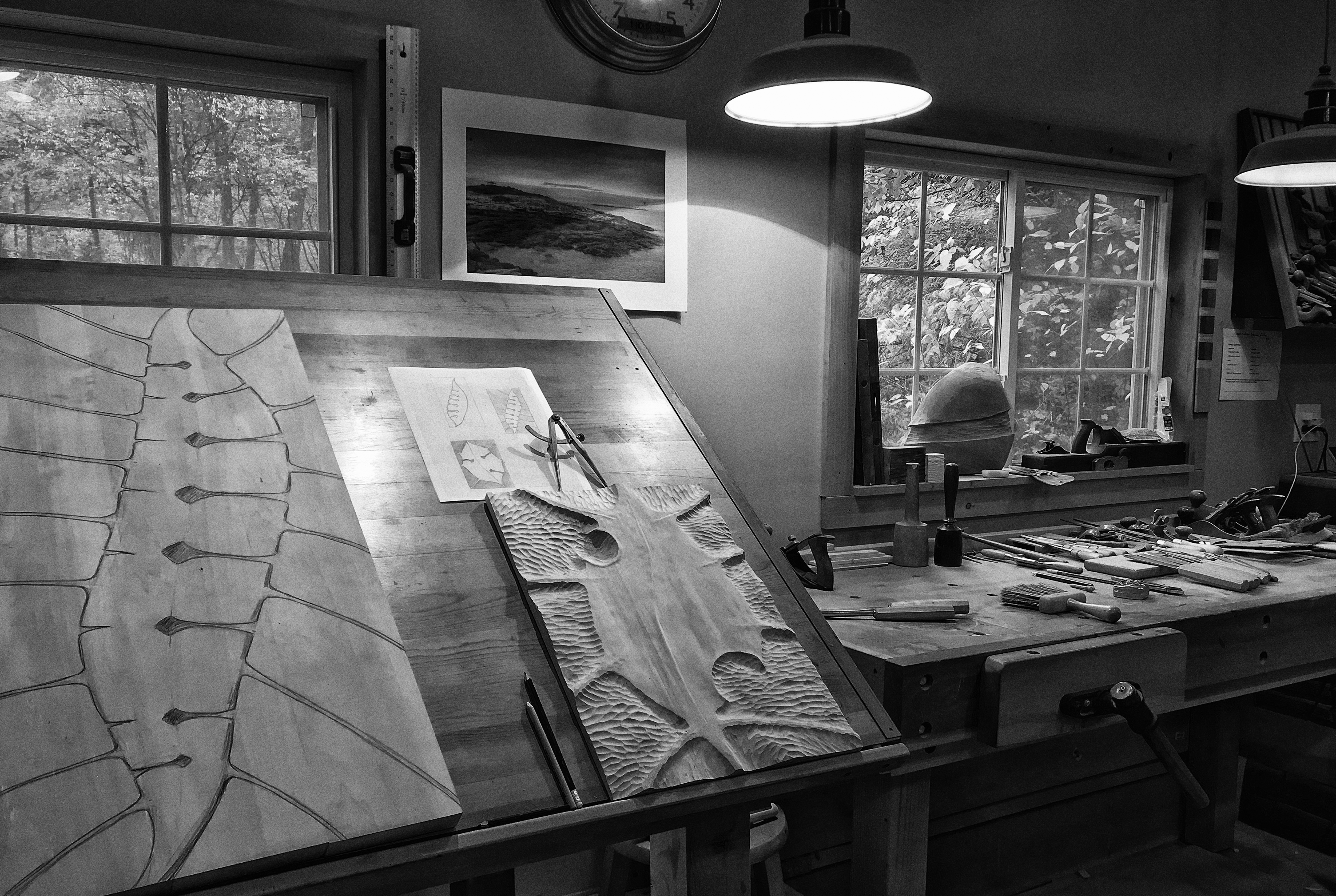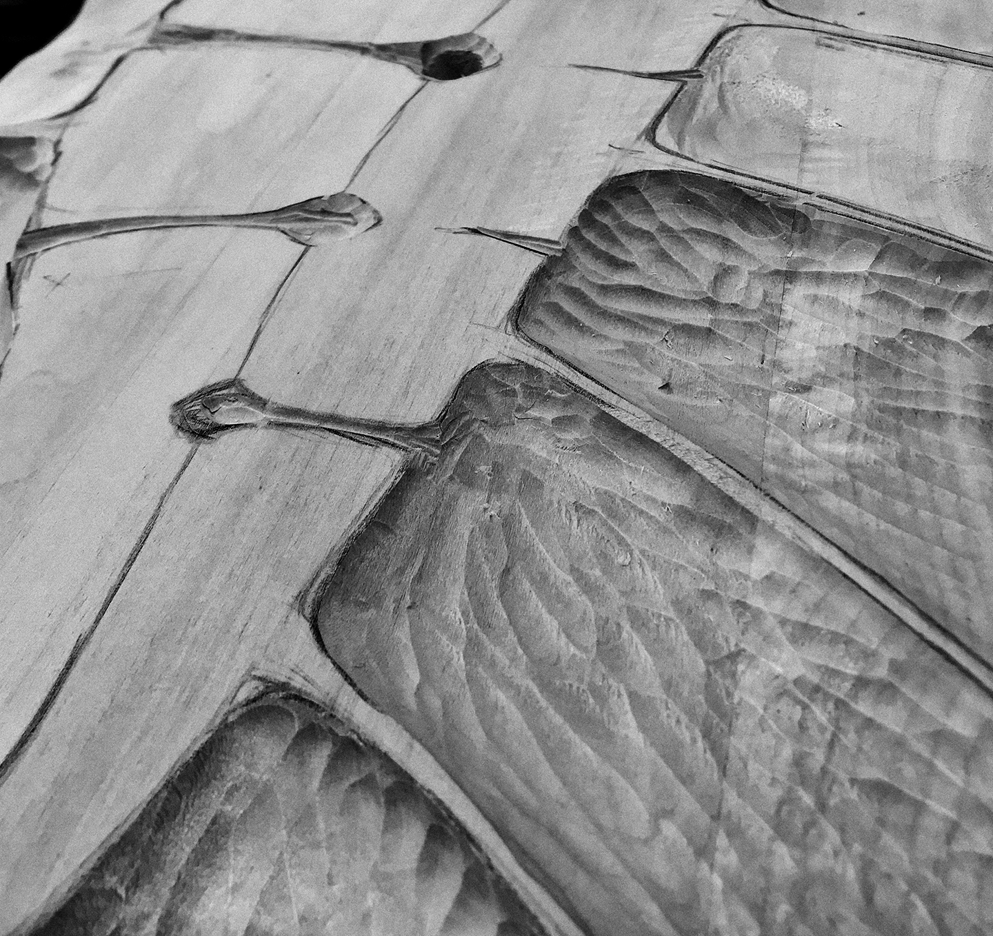 When a sketch is finalized and the panel is ready to be worked, large areas are addressed using whatever device is at hand and capable of fast and accurate material removal. This is in no way an artistic step; it does give a first glance at what lies beneath the planed surface. It allows time to think about grain complexity, direction, and problem areas. Once complete, a whole new level of on-panel sketching is required so that thoughts from the original drawing are not lost and issues are resolved. Now drawing on a real topography, I’m able to start to see where the piece can go.