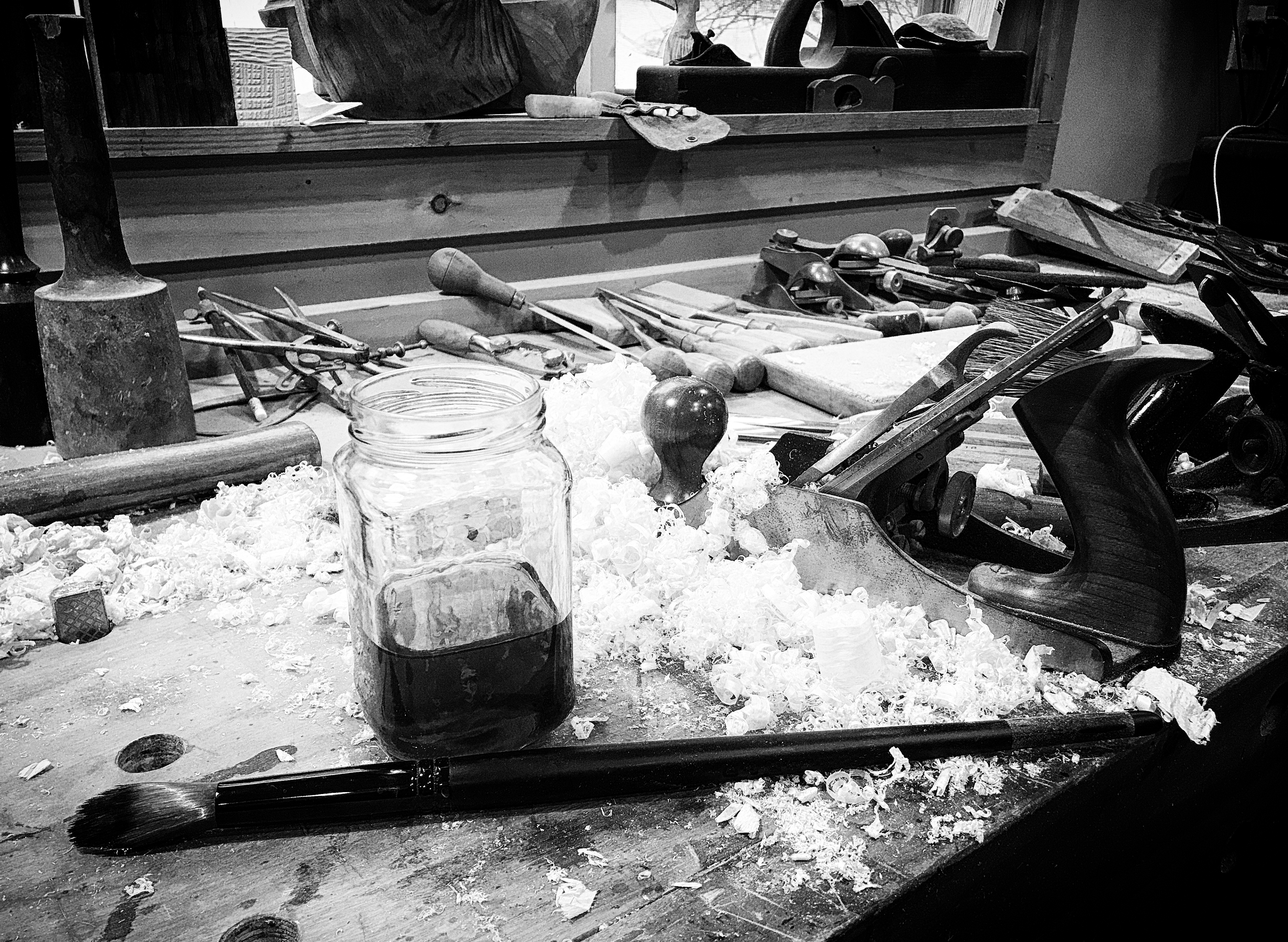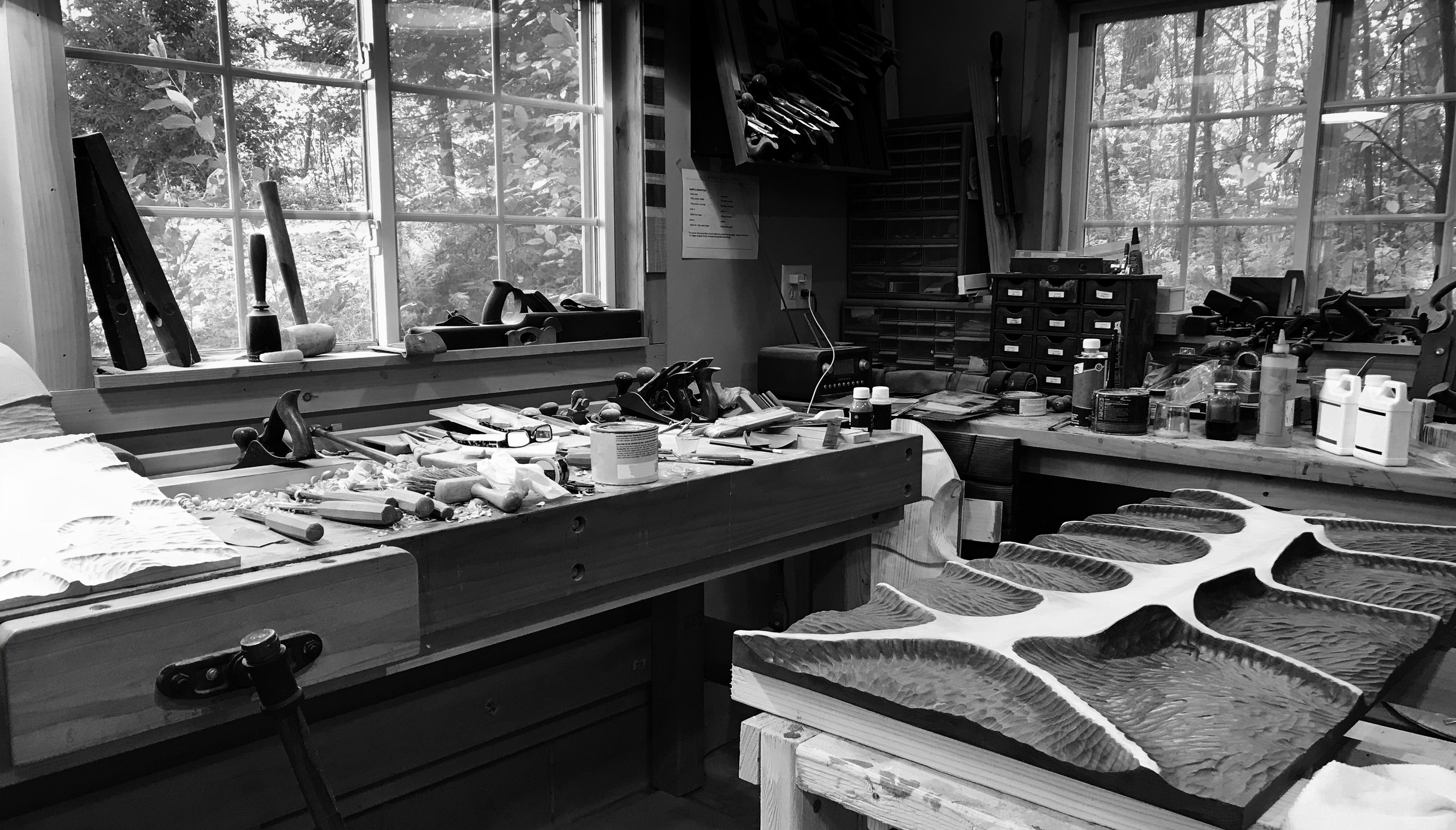 At a technical level, I have settled on a small variety of wood species. The results that can be achieved in richness and color of Red Cedar are worth the amount of dust necessary to get there. Linden, while not as interesting in grain or color lends itself to the most pleasant way to spend a day with a chisel. Other species include Spruce, Cherry and Maple. I don’t really have a use for commercial stains, colorants or finishes. Most color is derived from the afore mentioned chemical reaction approach. Prior to the availability of commercial stains in cans on store shelves, carpenters and cabinet makers relied on chemical stains. These compounds could be risky to use and inconsistent in results. I have only scratched the surface of what is possible, but I have what I need. Tannic acids, either naturally present in the wood or added, confronted with an oxidation solution results in a range of grays, blues and browns much more natural in appearance than anything available in a can. Selectively masking areas from reaction by using solutions to remove tannins completes the coloration process. Final finish coats are applied that may include additional coloration or toning by adding dry earth pigments, wax, rust and other compounds.